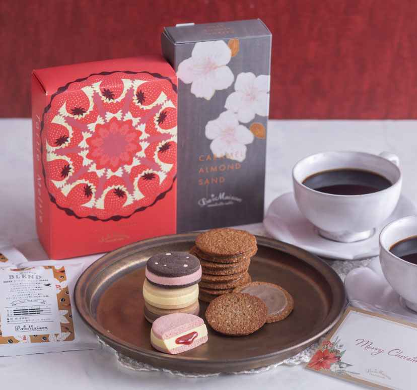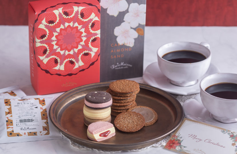 香ばしいアーモンドクッキーに口溶けの良いキャラメルチョコをサンドした「キャラメルアーモンドサンド」と、ラ・メゾンのタルトの味わいが楽しめる「タルティ・メルティ」の2種類の焼き菓子に、ドリップバッグコーヒーを組み合わせた期間限定のアソートです。