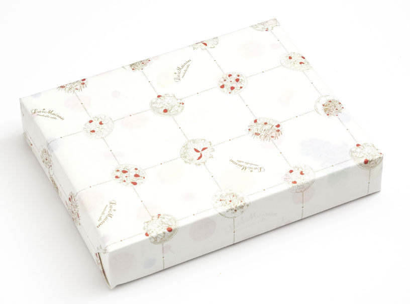 ラ・メゾンのフルーツタルトのイラストが全面に描かれた、オリジナル柄の包装紙で包装いたします。