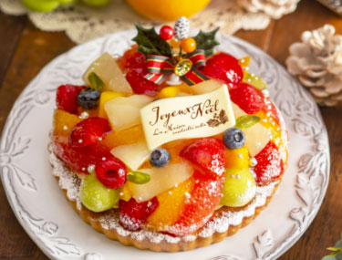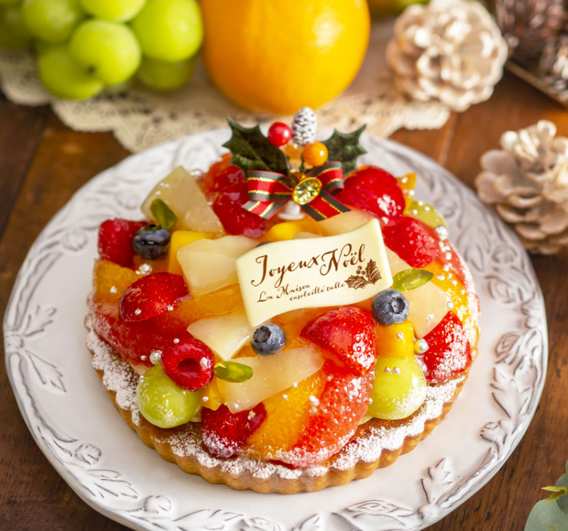 バター香るサクッと香ばしいアーモンドのタルトに、甘みが強く赤色が美しい『とちあいか』ジューシーで甘い『紅まどんな』、香りが良くなめらかな食感の『ル・レクチェ』コンポート、グレープフルーツ、ぶどう、マンゴー、フランボワーズ、ブルーベリーの8種のフルーツを彩り良く飾りました。