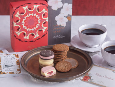 香ばしいアーモンドクッキーに口溶けの良いキャラメルチョコをサンドした「キャラメルアーモンドサンド」と、ラ・メゾン オリジナルハーブティー「ベリールージュ」の茶葉を組み合わせた、期間限定のアソートです。